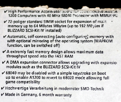 The card is designed for a towered A1200 (the SIMM hangs out of the trapdoor of a desktop A1200) but I've been using it in my desktop A1200 for a couple of years by elevating the A1200 with larger feet), I'm sure this isn't recommended though! Bear this in mind if you don't have a towered A1200.