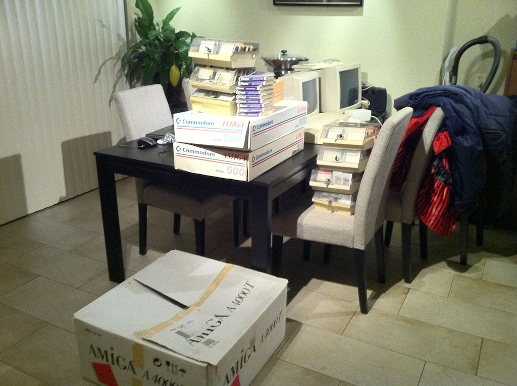 First picture show the A4000T connected to the Amiga M1764 monitor. An A500 (with German keyboard layout) and a bit of the GVP A530 (both are for sale). The second picture shows the Amiga4000 box, 2x A500 box (one of the A500's is in there) and 8 boxes full of Amiga software.