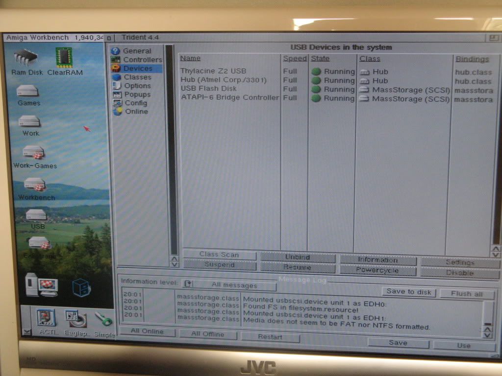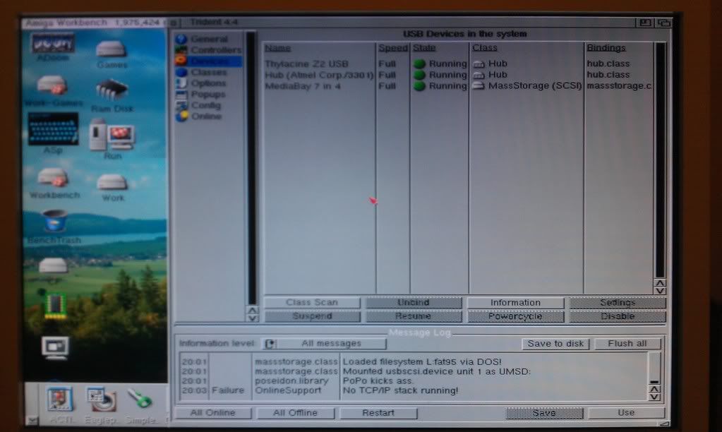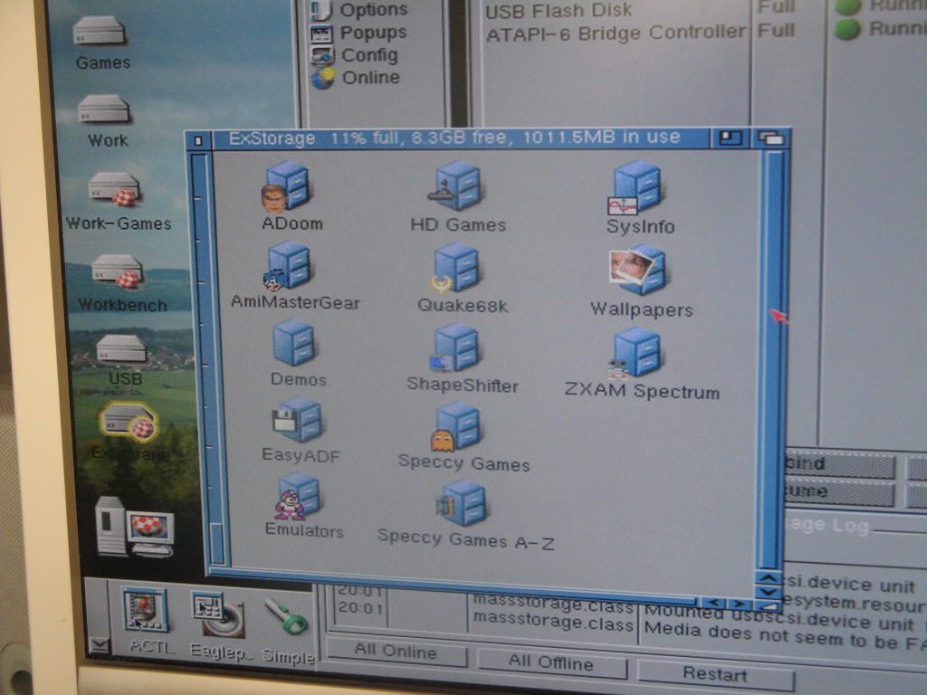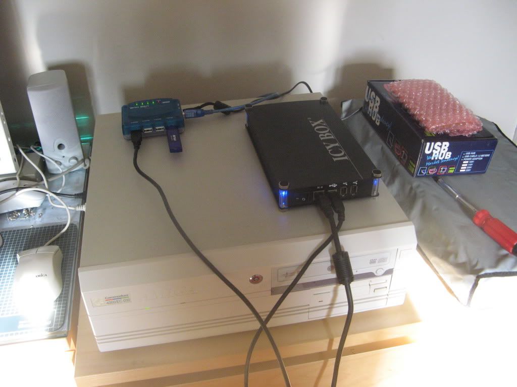 In the pics below its on the Thylacine in this A4000 so only USB1.1, I got a little Powered USB1.1 Hub of eBay for peanuts and its working a treat plus ideal as the Thylacine only has 1 USB port...