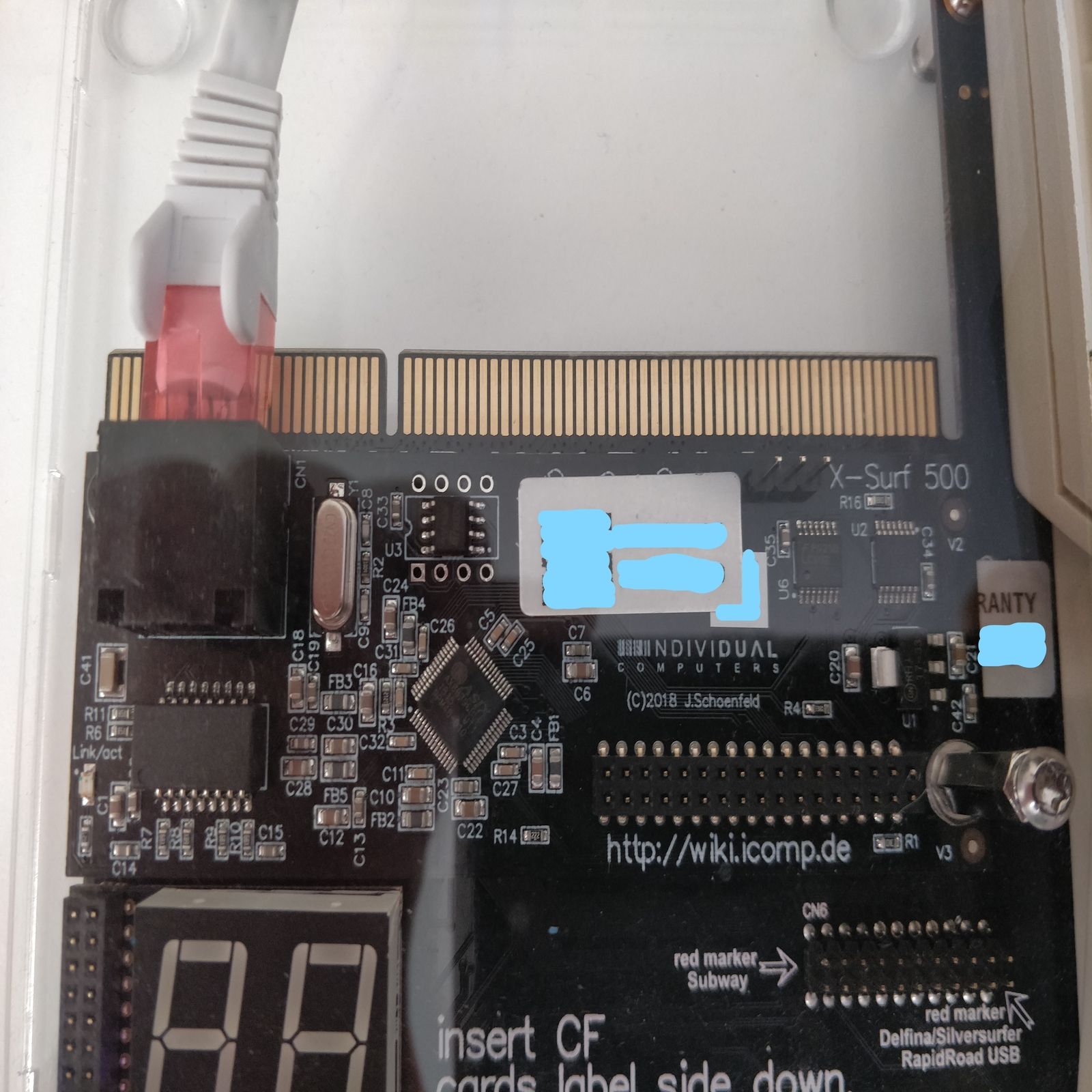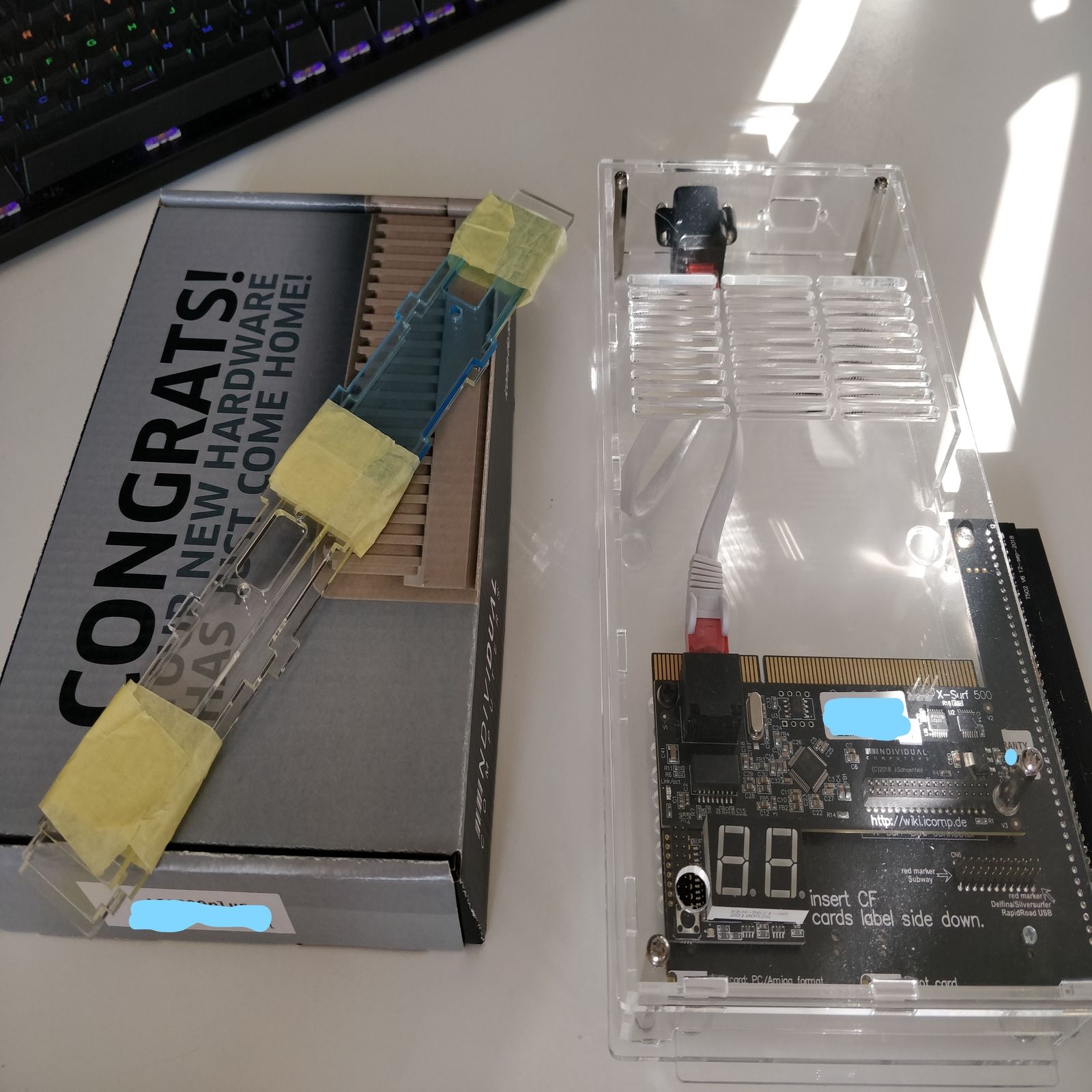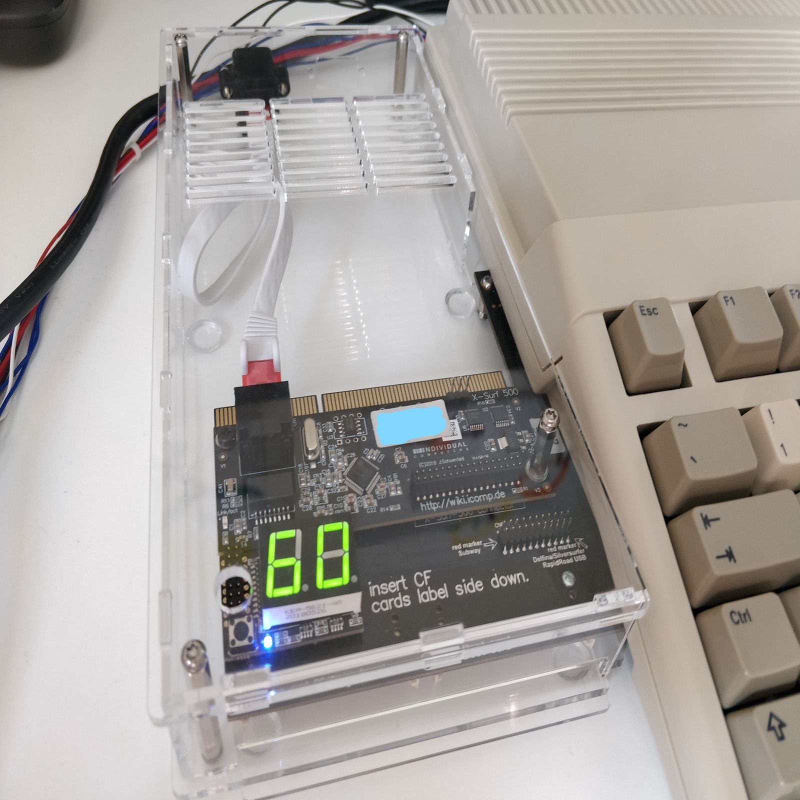 I'm selling my ACA500+ with X-Surf 500. It's cased in a laser-cut acrylic case from plexilaser.de, with an RJ45 extension leading to the back of the case for easy access for plugging/unplugging. The case is height matched perfectly for sitting alongside the Amiga 500. See photos for details.